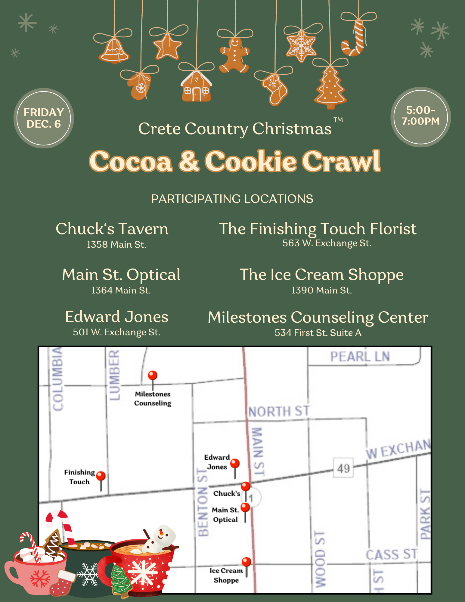 Participants will be able to stroll around beautiful downtown Crete to participating businesses to enjoy a warm cup of cocoa and/or cookies in your limited edition 2025 Crete Country Christmas™ mug! Each business will offer something different!